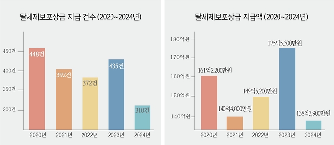 국세청이 ‘포상금 지급심의위원회’ 심의를 거쳐 지급한 포상금은 한해 평균 300~400여건 수준이다. 가장 최근 자료인 2024년 치를 보면 포상금 지급 건수는 310건 정도다. 지급된 포상금은 138억3천900만원으로, 건당 4천464만2천원 수준이다. 직전인 2023년엔 좀 더 많았는데 435건에 대해 175억5천300만원(건당 4천35만2천원)을 지급했다.