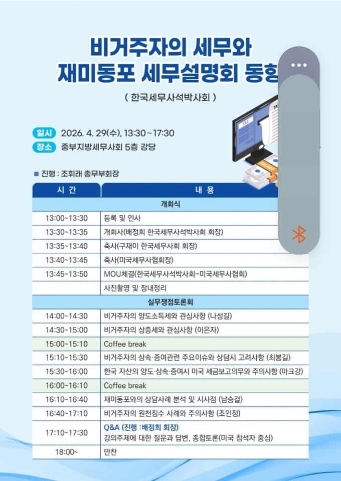 주제발표 후에는 배정희 회장의 진행 아래 질의응답(Q&A) 시간이 이어진다. 또한 미국 세무설명회에 직접 참석했던 조세전문가들을 중심으로 한 종합토론이 진행돼 현장의 생생한 목소리와 실무적 해법을 공유할 예정이다.