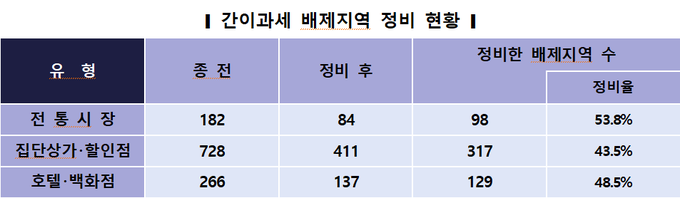 국세청이 발표한 간이과세 배제지역 정비 방안에 따르면, 배제지역에 해당하는 전통시장·집단상가·할인점·호텔 및 백화점 등 총 1천176개 지역 가운데 544개(46.3%)를 정비했다.