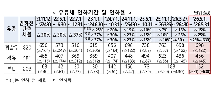 우선 LPG부탄 유류세를 5월1일부터 6월30일까지 추가 인하한다. 이번 조치로 유류세 인하폭은 10%에서 25%로 확대되며, ℓ당 할인액은 20원에서 51원으로 늘어난다.