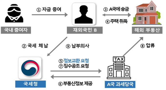 국세청은 B가 고액의 자금을 A국에 송금한 사실에 착안해 A국의 과세당국에 B의 해외재산 내역을 정보교환을 요청했으며, B가 대도시 호화주택을 대출 없이 전액 현금으로 취득한 정보를 제공 받았다.