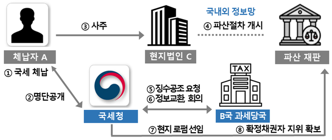 국세청이 현재 해외 과세당국과의 징수공조를 진행 중인 것으로는 사상 최초로 해외파산절차에 채권자로 참여한 사례와 함께, 재외국민 신분을 이용한 악성 체납자에 대한 압류조치가 대표적이다.