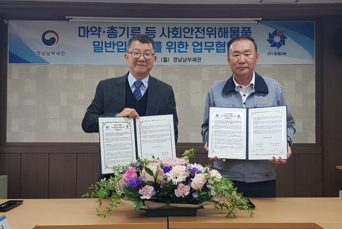 경남남부세관(세관장·김헌주)은 27일 ㈜유경CM과 마약·총기류 등 사회안전위해물품의 국내 불법 반입 방지 및 밀수 차단을 위한 업무협약(MOU)을 체결했다.