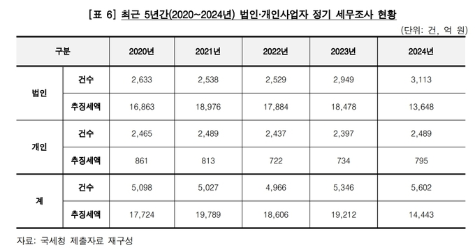 연도별 법인 및 개인사업자 세무조사 건수는 2020년 5천98건, 2021년 5천27건, 2022년 4천966건, 2023년 5천346건, 2024년 5천602건으로 5년간 2만6천39건 실시됐다.