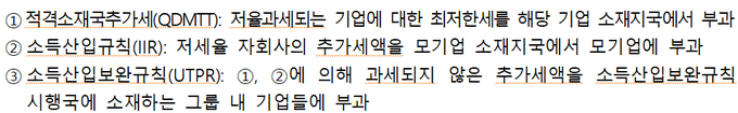 다국적기업그룹의 국가별 실효세율이 최저한세율(15%)에 미달하는 경우 그 부족분을 일정한 규칙과 순서에 따라 저율과세된 기업의 소재지국 외에도 모기업 및 그룹 내 다른 기업이 소재한 국가에서 과세할 수 있다.