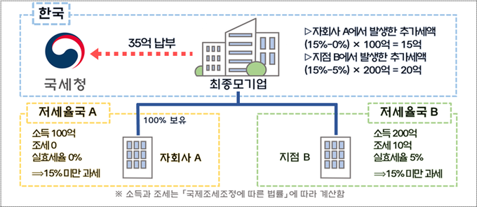 우리나라는 2024년 사업연도의 경우 소득산입규칙이 적용되며, 해외 자회사나 지점이 15% 미만으로 과세된 경우 한국에 있는 모기업은 우리나라에 추가세액배분액을 신고·납부해야 한다.