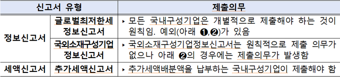 신고서 종류는 정보신고서와 추가세액신고서로 구성되어 있으며, 글로벌최저한세가 적용되는 다국적기업그룹의 모든 국내구성기업은 신고·납부기한까지 글로벌최저한세정보신고서를 제출해야 한다.