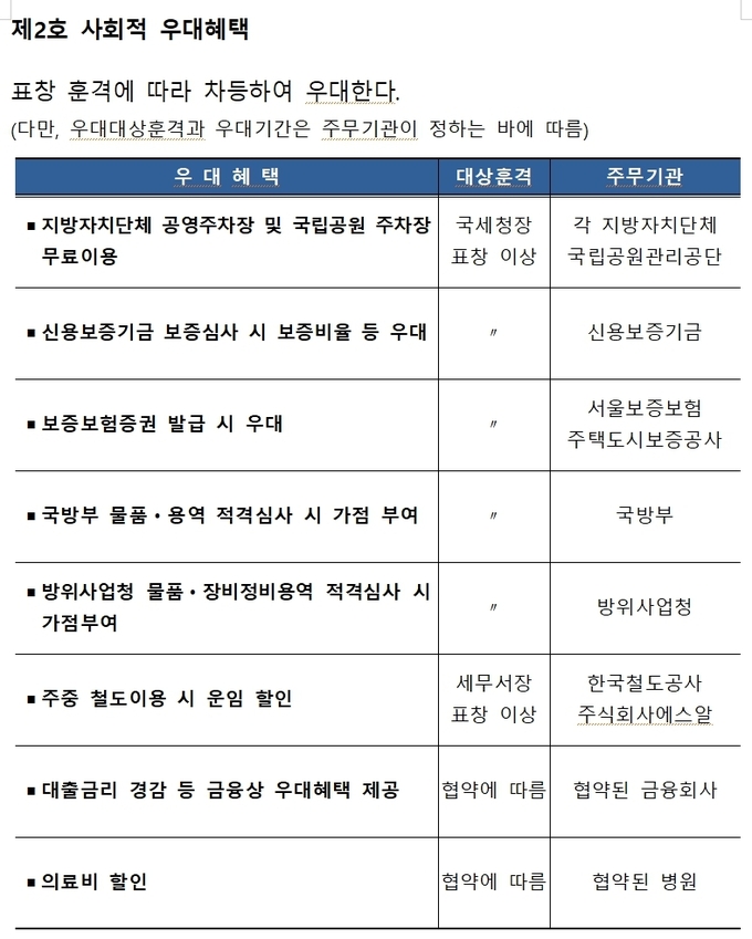 세무조사 유예, 정기 세무조사 착수 시기 선택, 지자체 공영주차장 및 국립공원 주차장 무료 이용, 신용보증기금 보증심사시 보증 비율 우대, 보증보험증권 발급시 우대, 국방부 물품·용역 적격심사시 가점 부여, 방위사업청 물품·장비정비용역 적격심사시 가점 부여, 주중 철도 이용시 운임 할인, 대출금리 경감 등 금융상 우대, 의료비 할인의 혜택을 받는다.
