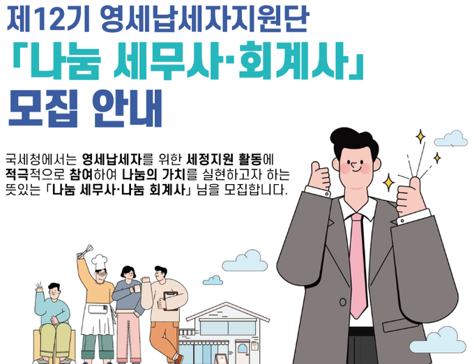 국세청은 영세납세자의 세금문제 해결에 적극적으로 참여해 나눔의 가치를 실현하는 제12기 영세납세자지원단 ‘나눔세무사·회계사’ 모집공고에 나섰다.