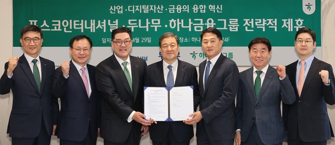 하나금융그룹(회장·함영주)은 지난 29일 명동사옥에서 포스코인터내셔널, 두나무와 금융·산업·디지털자산간의 융합 혁신으로 미래형 글로벌 금융 생태계 교두보 마련을 위한 3자간 업무협약을 체결했다.